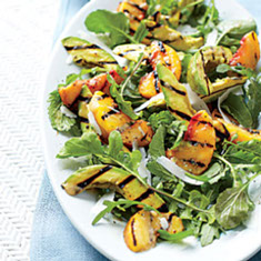 Preheat grill to 350° to 400° (medium-high) heat. Process 1 large peach, peeled and chopped; 6 Tbsp. canola oil; vinegar; and honey in a blender until smooth. Add 1/4 tsp. kosher salt and 1/8 tsp. freshly ground pepper. Gently toss 3 large peaches, peeled and halved, and avocados in 1 Tbsp. canola oil and salt and pepper to taste. Grill, covered with grill lid, 2 minutes on each side or until charred. Slice and serve over arugula. Top with peach vinaigrette and Manchego or Parmesan.